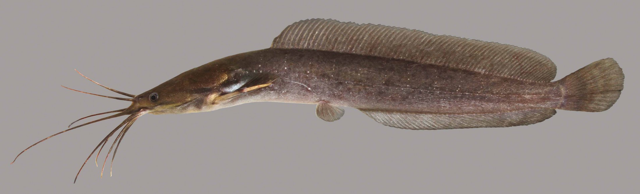 The walking catfish is part of the labyrinth catfish family. This species has an elongate body, flattened head and extremely long dorsal and anal fins. The head and body are uniformly gray to grayish-brown, and there are four pairs of barbels. Walking catfishes can be found in rivers, creeks, lakes, swamps, ditches, wetlands and canals with soft substrates – with or without vegetation – and is tolerant of turbid, muddy, hypoxic and brackish waters.