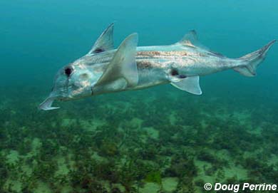 The club-like projection on the snout of the ghost shark is used to search for prey. The end is covered in pores that sense movement and weak electrical fields. Ghost sharks feed primarily on shellfish and molluscs including the clam Maorimactra ordinaria.
