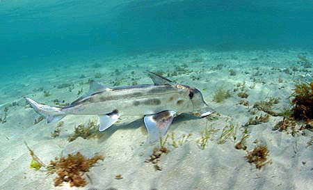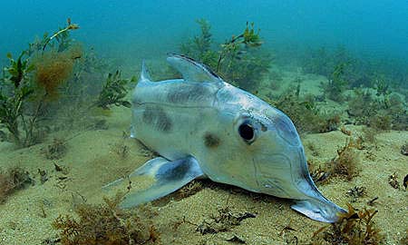 This unusual family of ‘chimaera’ branched off from sharks almost 400 million years ago. The ghost shark is easily identified because of their very large, high-set eyes, and the club-like structure at the end of their snouts. Their protruding snout is made to search for food prey in the sand, and is highly sensitive to electric fields and movement. They have a dangerous spine just ahead of their dorsal fin, and sport fishers should handle this shark with caution.