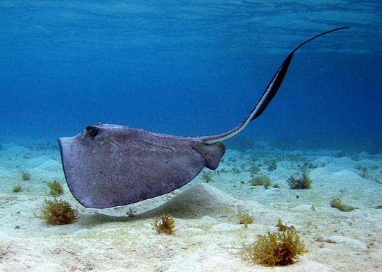 The southern stingray is a non-aggressive animal, posing little threat to humans. However, when stepped on, the ray will use its spine in defense.