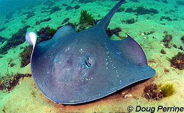 The largest of the rays, these can grow up to almost 7 feel across and 770 pounds. They’re slightly diamond shaped, wider than they are long, with a stocky tail shorter than the length of their bodies as adults. Although they are slow-moving in general, they can flap their pectoral fins fast enough to create a small shock wave (cavitation) if threatened. They usually have two stinging spines in their tails, but are not aggressive and cause harm to humans only when startled or threatened.