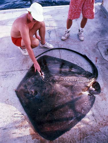 This is the largest of the whip-tail stingrays, growing over 7 feet wide and more than 660 pounds. Its diamond-shaped disc is dark brown or olive above and almost white below. The tail is black, and can be two and a half times the length of its body. Caution is suggested when interacting with the roughtail stingray, because although it is not aggressive, it has poisonous serrated tail spines, and a row of thorny tubercles down its spine and tail. It lives deeper than the casual beach-goer would normally encounter, but off-shore sports fishers and divers might encounter this stingray.