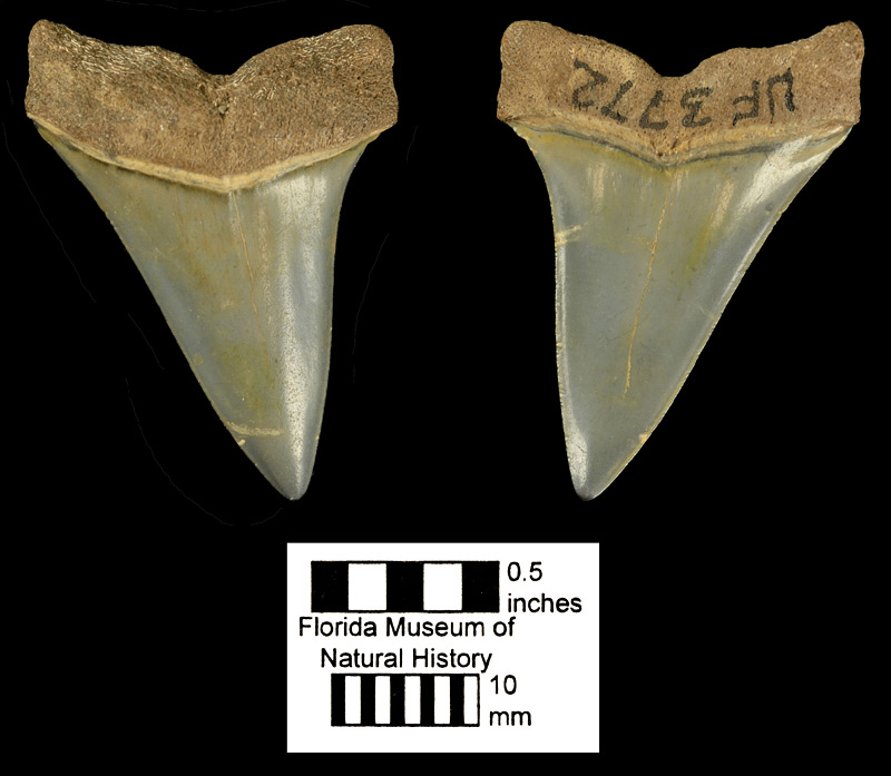 The upper teeth of Carcharodon hastalis are broadly triangular with smooth, unserrated cutting edges (Figs. 2-4), while the lower teeth are narrower and have deeper root notches (Kent, 1994). Teeth from juveniles can have a single, very small cusplet on each shoulder. The teeth of juvenile Carcharocles megalodon and adult Carcharodon hastalis overlap in size, but the two can be easily distinguished by the lack of serrations on the cutting edges of the teeth in Carcharodon hastalis (present on teeth of Carcharocles megalodon and Hemipristis serra). Another difference is that teeth of Carcharocles megalodon have a region above the root with exposed dentine called a bourlette while teeth of Carcharodon hastalis lack such a feature, as is true of most other sharks. Fossil teeth of Isurus oxyrinchus, the shortfin mako shark, are common in Florida only on the northeast Atlantic coast (Duval and Nassau counties). Like Carcharodon hastalis teeth, they do not have serrated cutting edges, but differ in their much narrower, more curved crowns and longer root lobes (Kent, 1994).