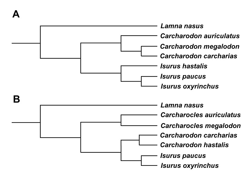 Several aspects of the classification and taxonomy of this species are currently under debate by researchers. Therefore, one will see many different names for it in scientific publications and on websites. One area of contention is into which genus to place the species. Traditionally, among members of the family Lamnidae, it was considered more closely related to the living mako sharks (Isurus paucus and Isurus oxyrinchus) than to the great white (Carcharodon carcharias) or porbeagle (Lamna nasus) sharks (Fig. 5A). This arrangement was also part of the hypothesis that Carcharodon carcharias was more closely related to megalodon and other gigantic extinct species with serrated teeth than it was to “Isurus” hastalis or any of the living species of Isurus (e.g., Applegate and Espinosa-Arrubarrena, 1996; Purdy et al., 2001; and Gottfried and Fordyce, 2001). Over the past decade, an alternate arrangement has gained favor with most researchers: that Carcharodon carcharias is not closely related to megalodon, but is instead more closely related to, and most likely the descendant of, “Isurus” hastalis (Fig. 5B; Muizon and DeVries, 1985; Nyberg et al., 2009; Ehret et al., 2012). This evolutionary transition is thought to have occurred in the eastern Pacific during the late Miocene, based on the presence there of a morphologically intermediate species, Carcharodon hubbelli Ehret et al., 2012. Workers favoring this hypothesis are divided among those who place “Isurus”hastalis in an extinct genus Cosmopolitodus (e.g., Ávila et al., 2012; Cook et al., 2010) and those who place it in Carcharodon along with the modern great white (e.g., Ehret et al., 2012). The classification used here follows Ehret et al. (2012).