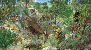 Other members of the Tyner Farm fossil fauna support this environmental reconstruction. Among those present were tree squirrels, foxes, a tiny deer and other large, browsing herbivores including some of the horses, a ground sloth, a shovel-tusked elephant and a giraffe-like camel with elongated legs and neck. Grass-eating specialists common at other late Miocene sites are either absent or very rare at Tyner Farm.