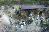 Like most of Florida’s Miocene fossil sites, the Tyner Farm locality began as a sinkhole, a familiar feature of the Florida landscape. As clay washed into the sinkhole, it covered the remains of animals that had fallen into the sinkhole or those of smaller animals such as mice, snakes and lizards that lived and died in the sinkhole. At times portions of the walls cracked and limestone boulders fell to the bottom of the pit, mixing with the bones (crushing some of them) and clay. The combination of the calcium carbonate from the limestone, the moisture-retaining clay, and phosphate grains present in the clay created a stable, chemically perfect environment to preserve the bones and teeth, even those only a few feet below the ground.