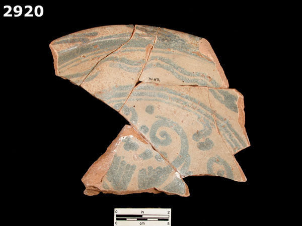 Light cream to buff paste color, with a soft, chalky clay texture. Occasionally pink. Paste is the same as that of Columbia Plain. Off-white, cream, or grayish-white tin enamel, usually covering both sides of the vessel. The quality of the enamel varies widely among vessels, from thin, irregular and shiny, to thick, matte and smooth. Exterior surface decorated with blue, hand-painted, broadly stylistic floral designs that cover much of the vessel. A central medallion design is often present, surrounded by floral and curvilinear elements. Design motifs include dots, lobes, and framing and wavy lines. Everted bowl rims often have a blue dash design. Vessels are typically large and heavy-bodied, sometimes with narrow ridges. |