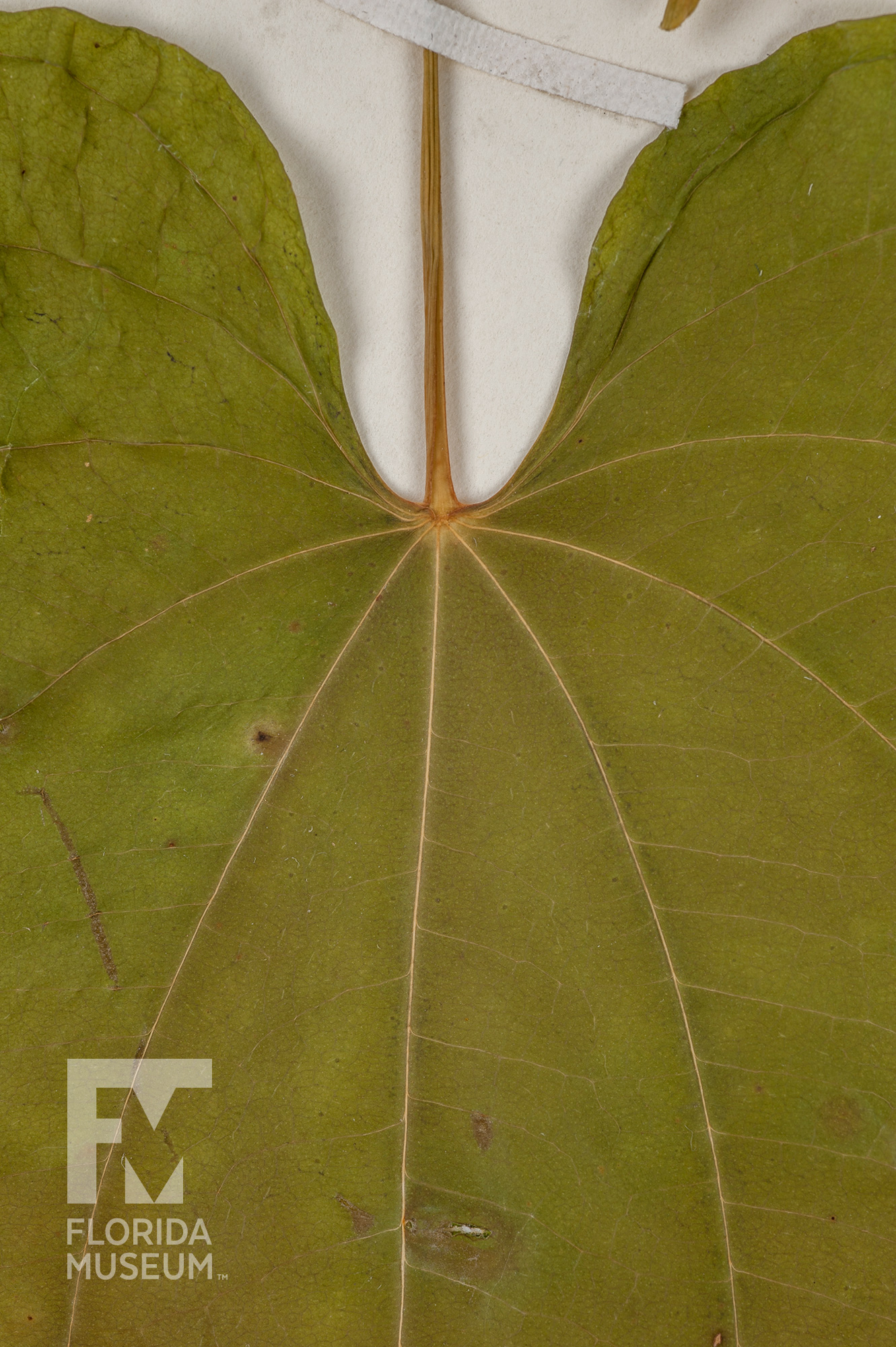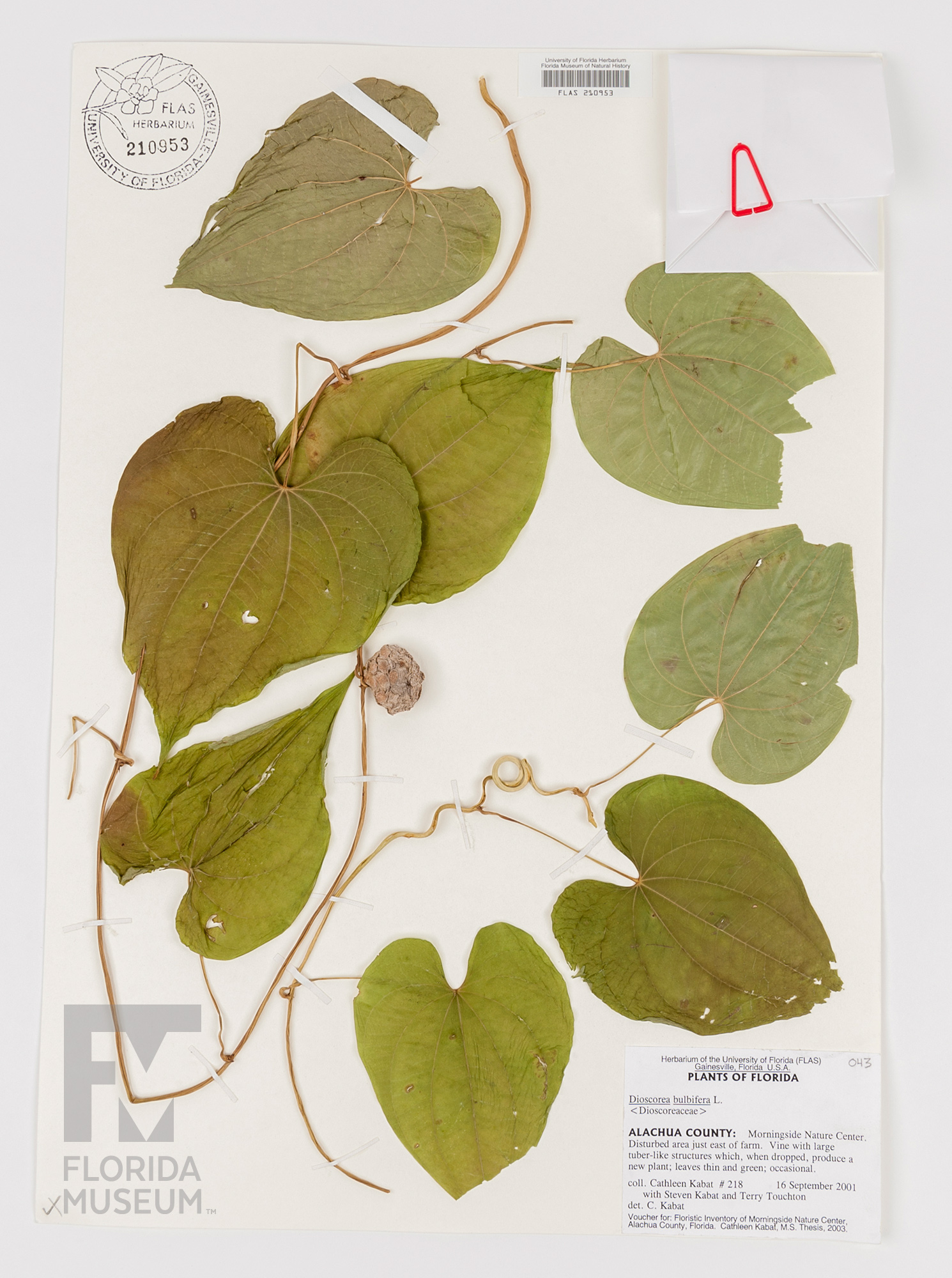This Herbarium specimen documents the presence of the air potato, Dioscorea bulbifera, in one of the nature parks here in Alachua County. Air potato is an invasive vine from the Old World tropics that is now found in almost every county in Florida. It’s said to have been introduced to the Americas from Africa during the slave trade.