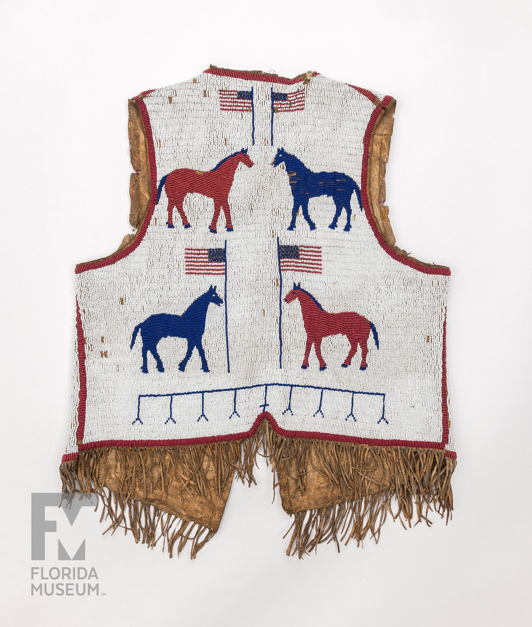 While using traditional methods and materials, the artisans realized that they could make the objects more attractive to tourists if they made objects in the style of other cultures or use symbolic icons from other cultural groups. For example, the tribes native to the northeastern U.S. began making women’s purses in the style of Victorian ladies purses using traditional beading techniques. In this case, we see that the artisan incorporated both horses – which were extremely important to the Plains Indians former nomadic way of life – and the American flag which represents the United States. Therefore, the vest represents a theoretical amalgamation of the two cultures, a concept which did not exist in reality.