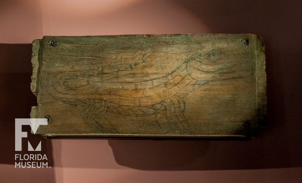 The legend of the horned serpent is a recurring theme throughout the Indian peoples of the southeastern United States and maybe this horned gator is the South Florida version of it. These painted wooden objects were found at the famous Key Marco site on present-day Marco Island. This painted image of a horned alligator is actually the side of a wooden box. You can tell how the box was made by looking at the edges. You can see other box sides in this same exhibit case. All have painted images, and you may have noticed that the paintings are all on the inside of the box, not on the outside!