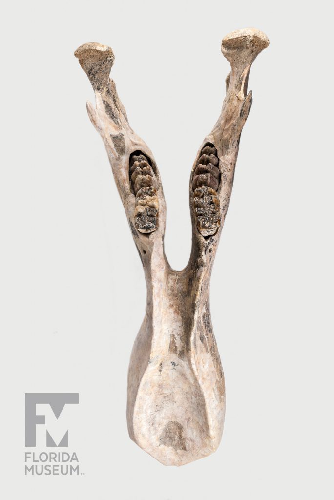 Among the many types of extinct elephant relatives we find in Florida, the shovel-tuskers are perhaps the most bizarre. They have these huge lower tusks that appear to resemble shovels, however analysis by Florida researchers has determined that they used these lower tusks for many purposes, including digging and scratching bark off of trees. This specimen, along with one other jaw, was found in Marion County during the construction of a racetrack for thoroughbred horses. This particular species, Amebelodon britti, is the largest-known land animal to have ever lived in Florida.