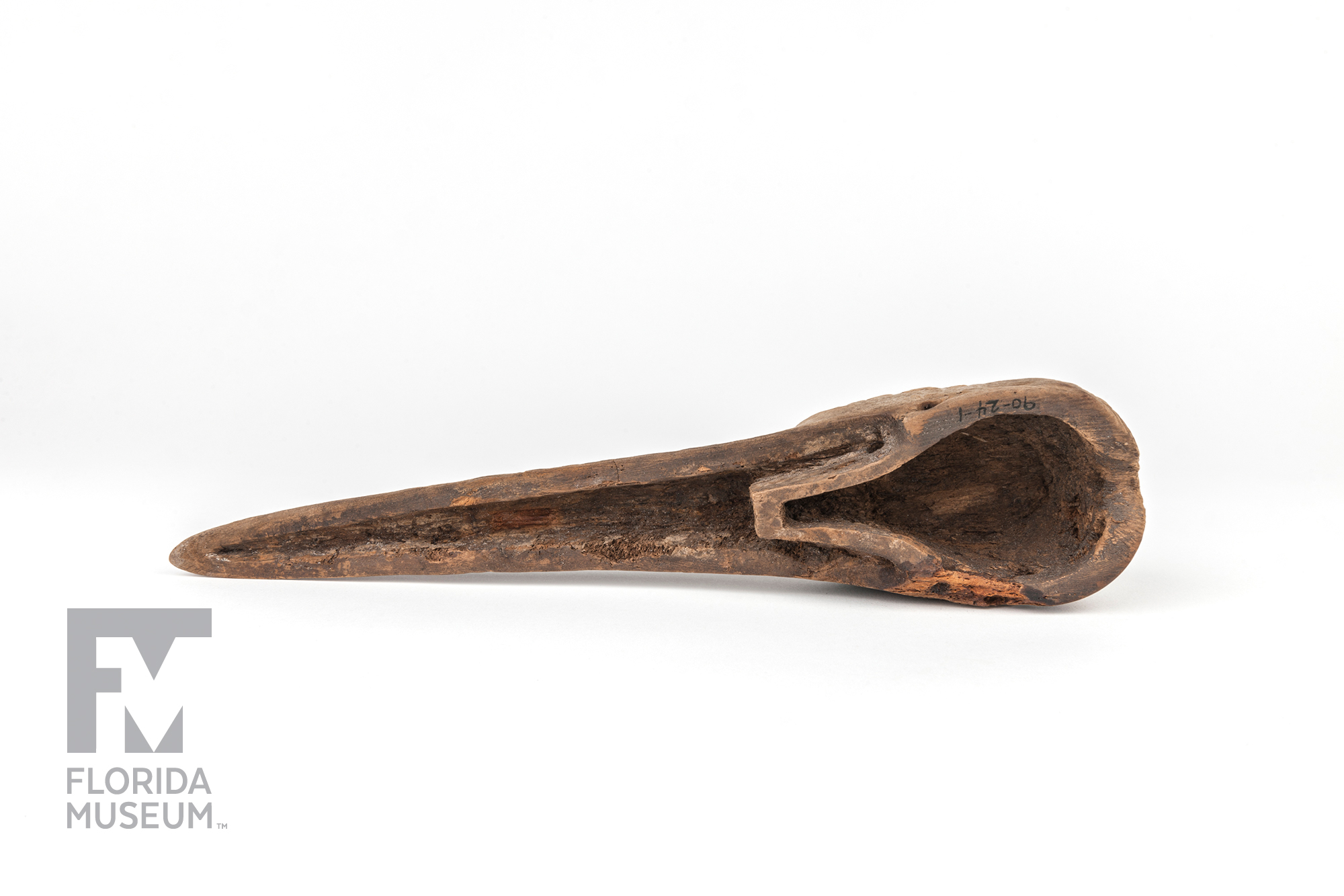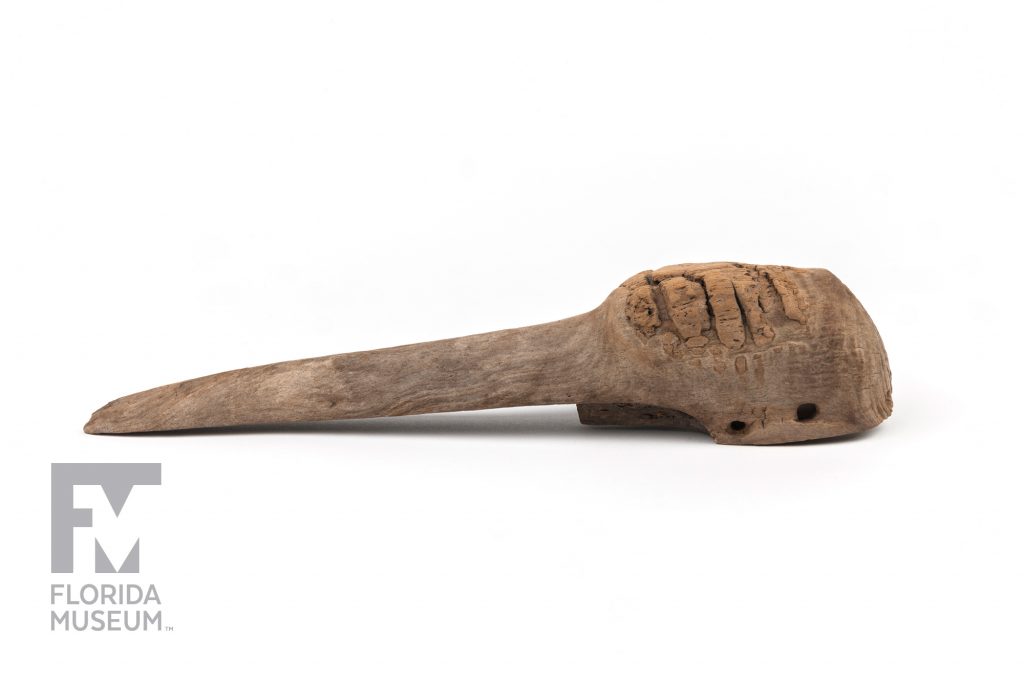 This carving of a crane’s head is made of cypress wood and it was found at the Pineland site in Southwest Florida. It’s about 1,100 years old. We believe it’s the top part of a two-part-bird-head effigy; but the bottom part was never found. The holes on the side were part of a mechanism to allow the beak of the carving to snap shut when a string was pulled. It might have been part of dramatic performance, or part of a costume of a dancer. What do you think?