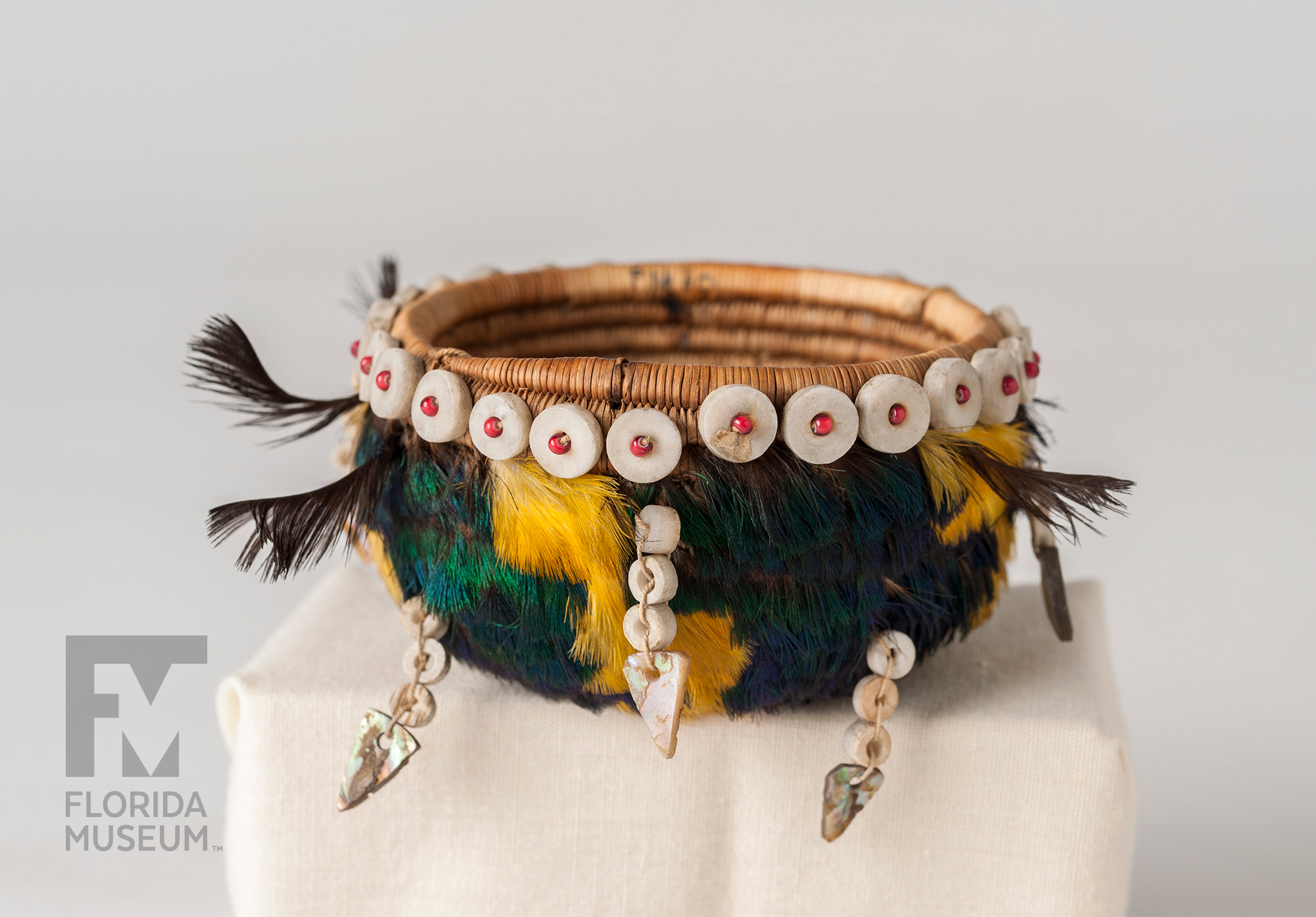 Baskets such as this one made in the late 19th or early 20th century sparked a craze in collecting baskets made by tribes in northern California. This Pomo basket is exceptionally small and jewel-like, shimmering with iridescent green mallard feathers. The coil basket is decorated with abalone pendants and clamshell beads tied with glass trade beads. To the Pomo, shell beads were like money, making such baskets treasured items that were often given as gifts.