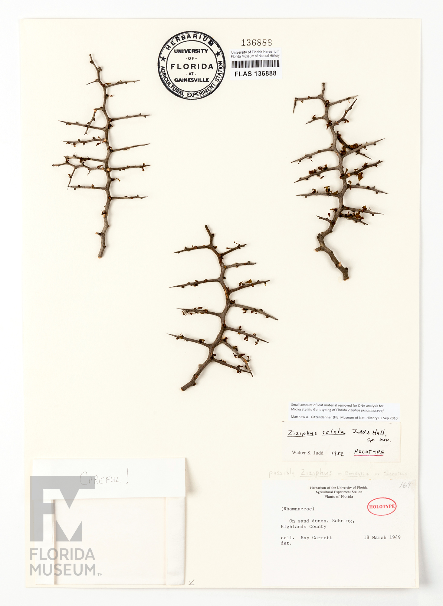 It was described in the early 1980s by David Hall and me on the basis of a specimen that had been collected in 1948 by Ray Garrett and then filed away in the Herbarium. The specimen was just a small twig, having only flowers and a few leaves, but we were sure that it represented an undescribed species! We searched in natural areas of Highlands County, where the specimen had been collected, but could discover no populations of the plant, so we formally described it as Ziziphus celata, on the basis of the old Garrett specimen. We chose the epithet celata, which means “hidden,” because we could not find any living plants. This situation is actually not that unusual – most new species are discovered in the Herbarium, not in the wild.