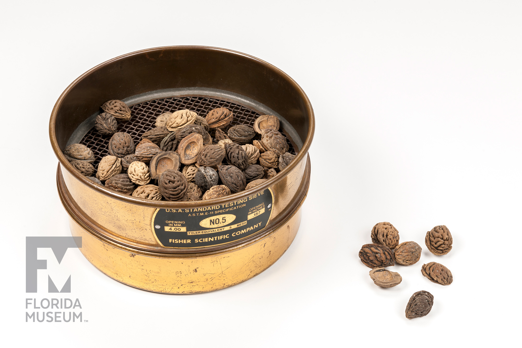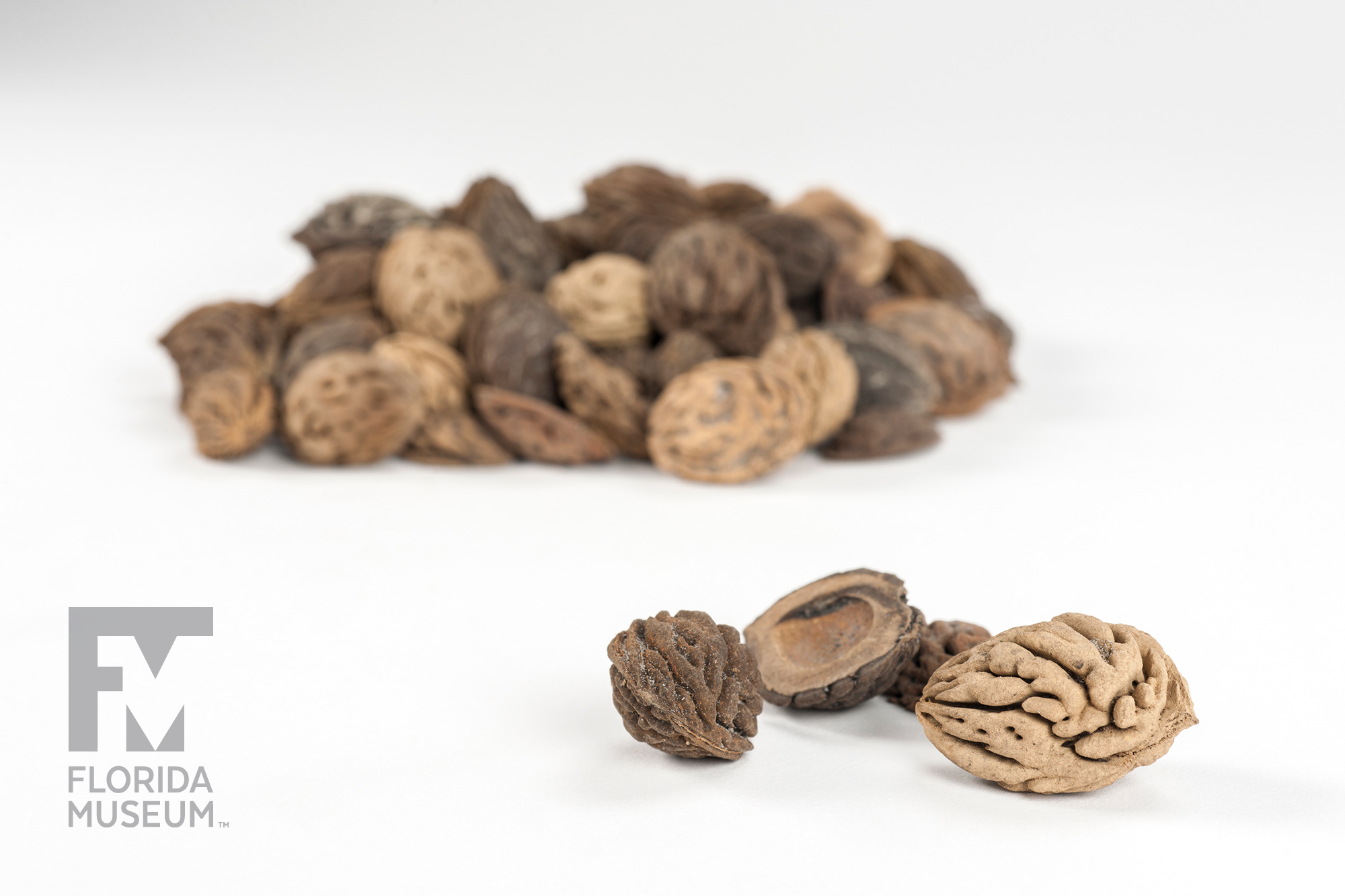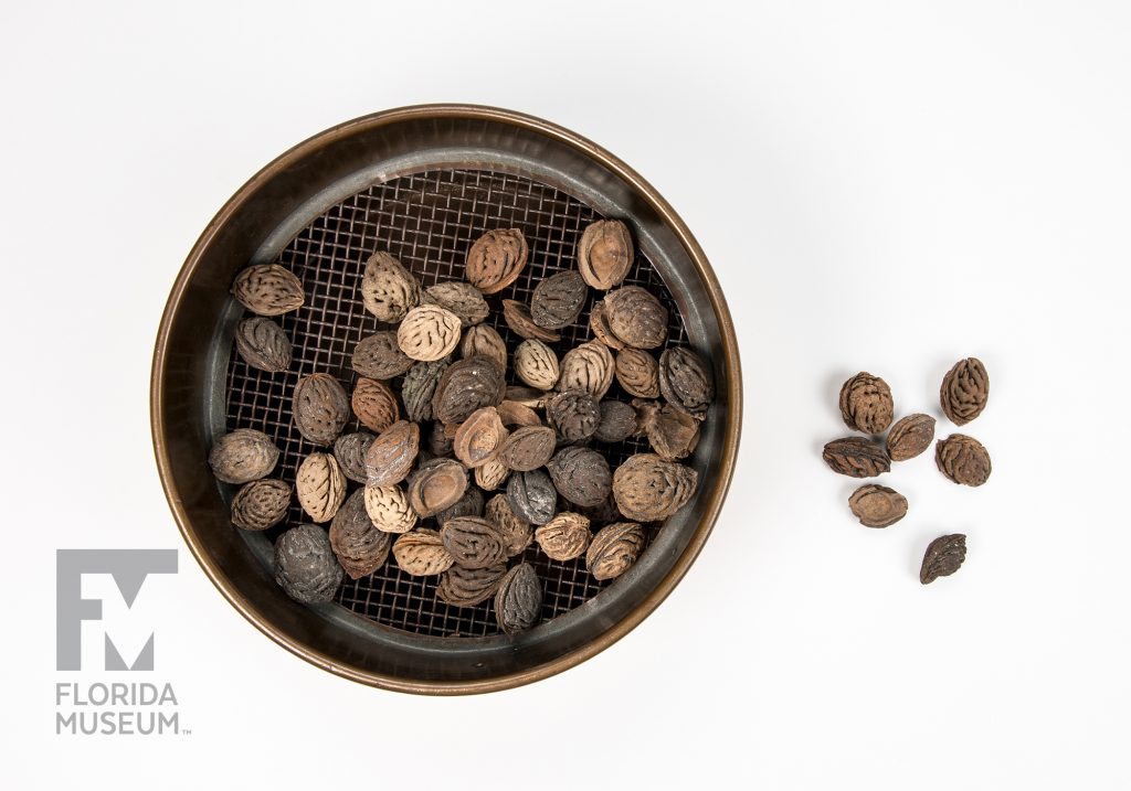 These few peach stones literally represent the hundreds and hundreds of peaches that were recovered from this rare archaeological find – along with other artifacts – from the Fig Springs site in Columbia County, which is the Spanish Mission of San Martin de Timucua. These were excavated by John Goggin, an archaeologist, back in the 1950s.