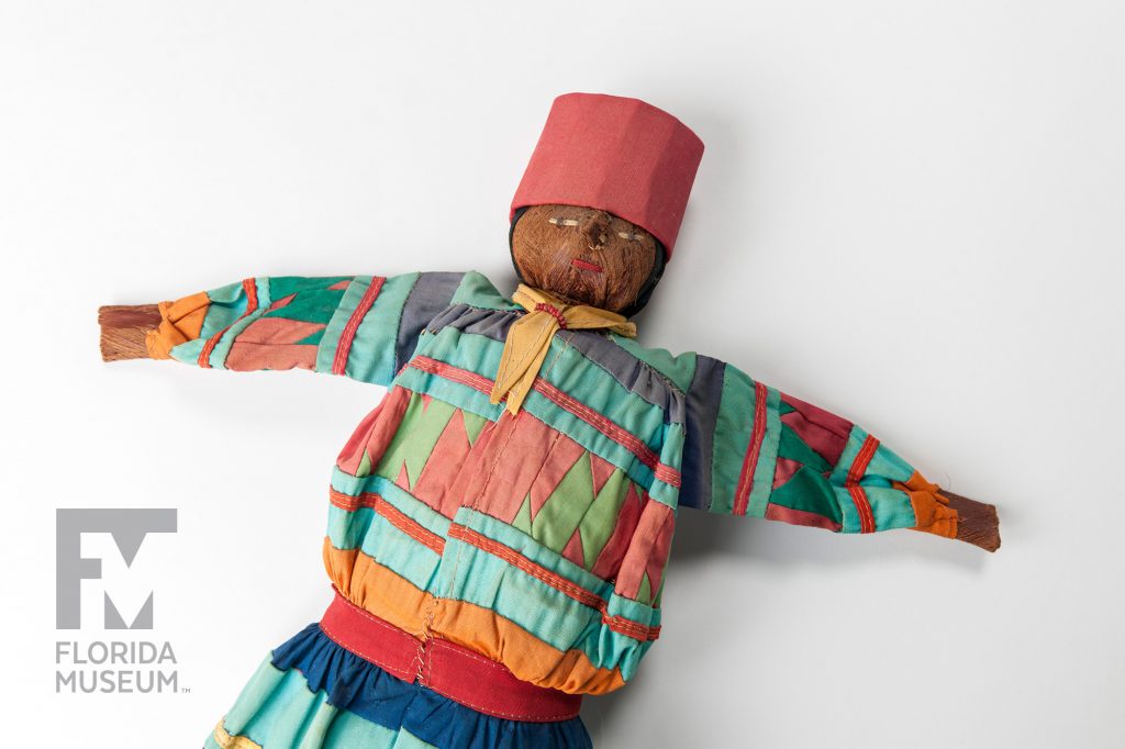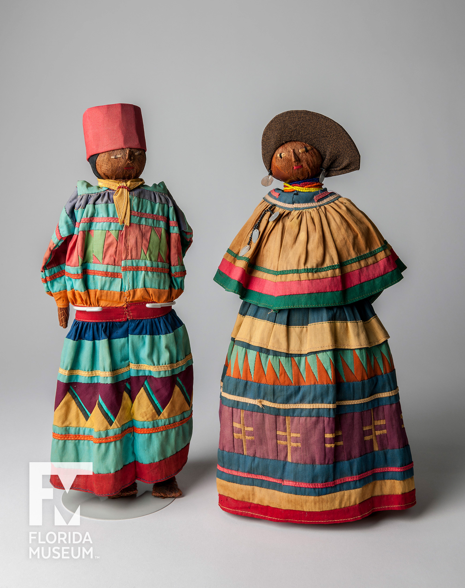 This pair of dolls, which was donated by Anne and Charles Reynolds, is an example of the traditional palmetto-fiber doll. The male wears a traditional long shirt, a kerchief and a turban. Unlike female dolls, males have arms, legs and feet, so they are more difficult to make. The female doll wears a skirt and a cape, and has a beaded necklace and silverwork, and a traditional hair board. The women wore their hair long and stretched it over a cardboard hair board. Beyond aesthetic appearances, the hair board also provided some shade while the women worked. Both dolls sport beautiful outfits and each has two bands of patchwork.