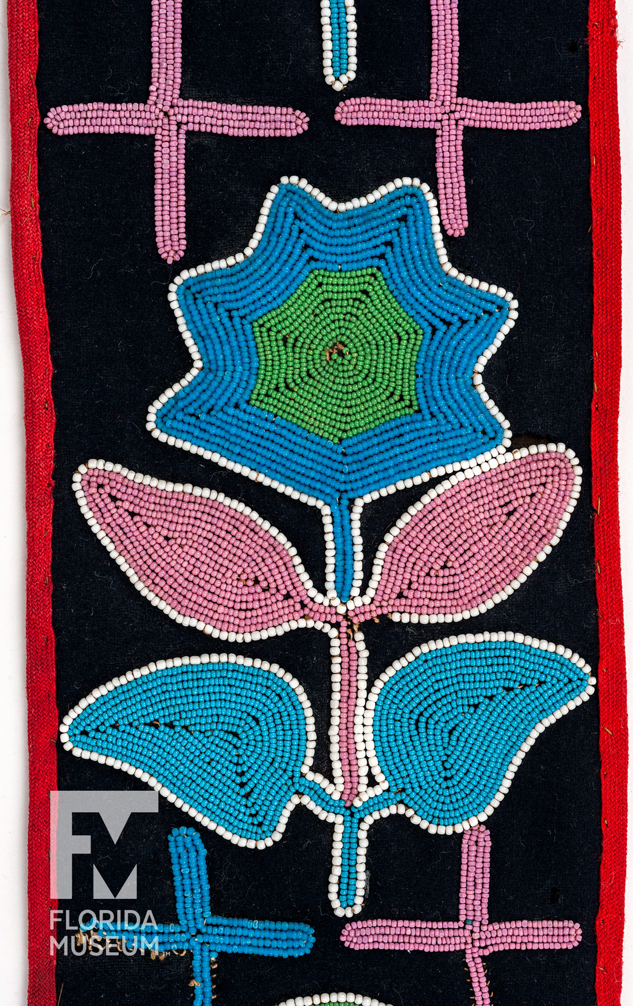 This is a man’s beaded shoulder bag made in the early 1800s. It’s very rare to have one this old that is in such great shape. Men wore these over the shoulder, with the pouch part resting on the opposite hip. They wore them on dress up occasions but they did carry various items in the pouch, such as tobacco, flint and steel for making fires, maybe a little whetstone for sharpening their knife. The bags are usually made of wool and beautifully decorated with many small beads. In this case, each shoulder strap terminates in three tabs with wavy designs and the pouch has curvilinear designs that touch one another and are almost intersecting. It has a triangular pouch flap, which is common in Seminole shoulder bags.