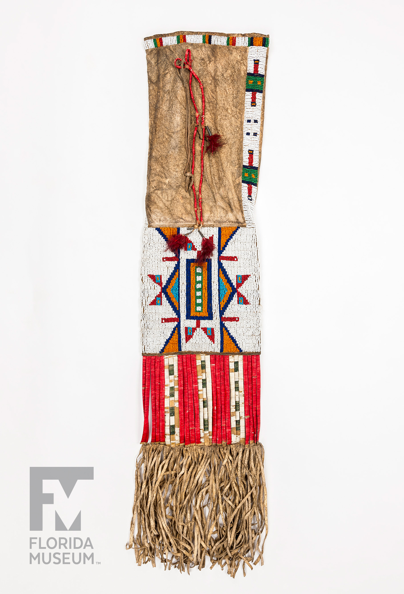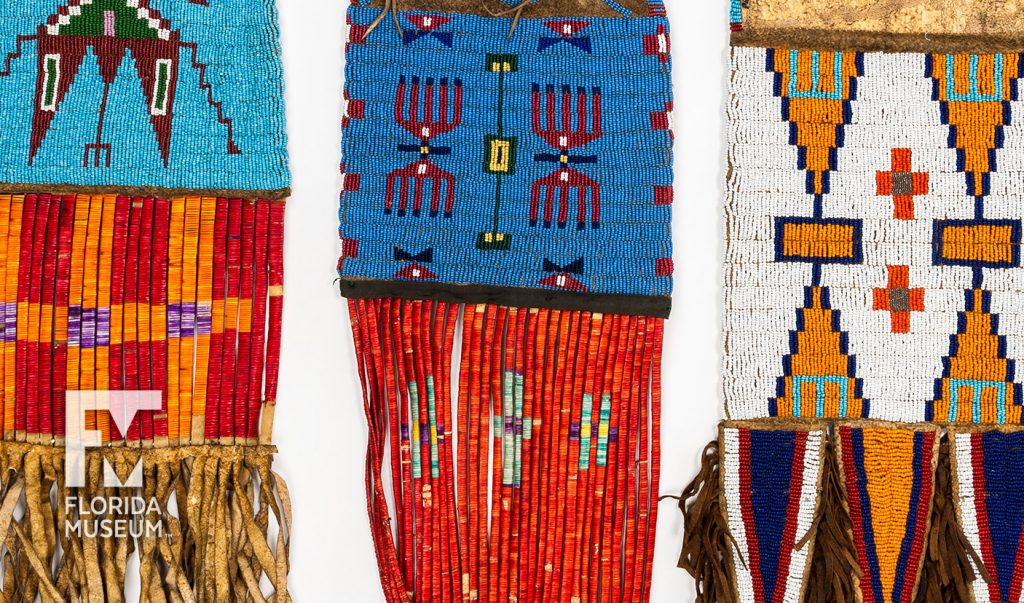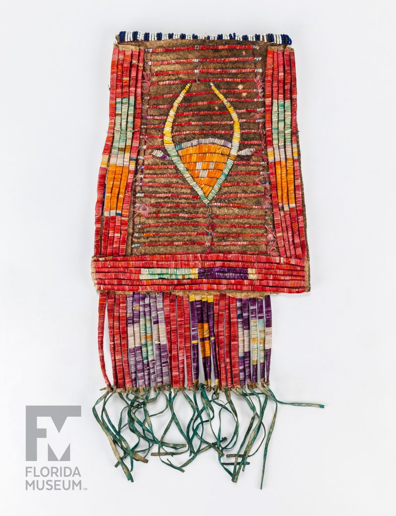 The central image depicts a bison, a sacred animal that was also a source of food and materials for clothing and furnishings in Plains Indian culture. Porcupine quillwork generally is earlier than beadwork in Plains Indian art. Later, artists began to use glass beads acquired through trade with European-Americans.