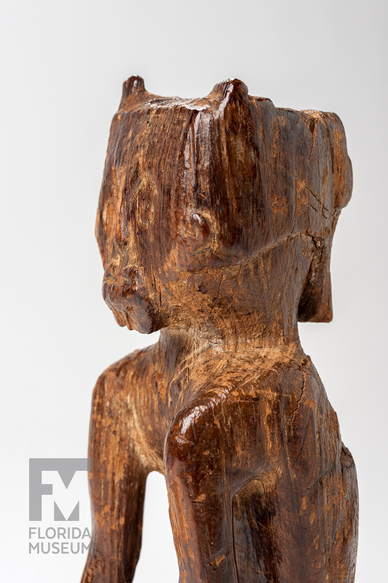 This figurine is carved from a single piece of wood and appears to be a human with short legs, kneeling on a platform, with the arms resting on the base in front of the knees. These figurines are quite rare – only about a dozen are known – and this one donated by the Padgett family is in excellent condition.
