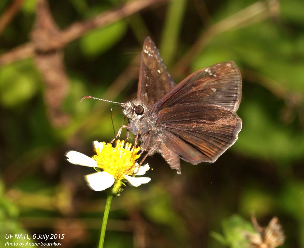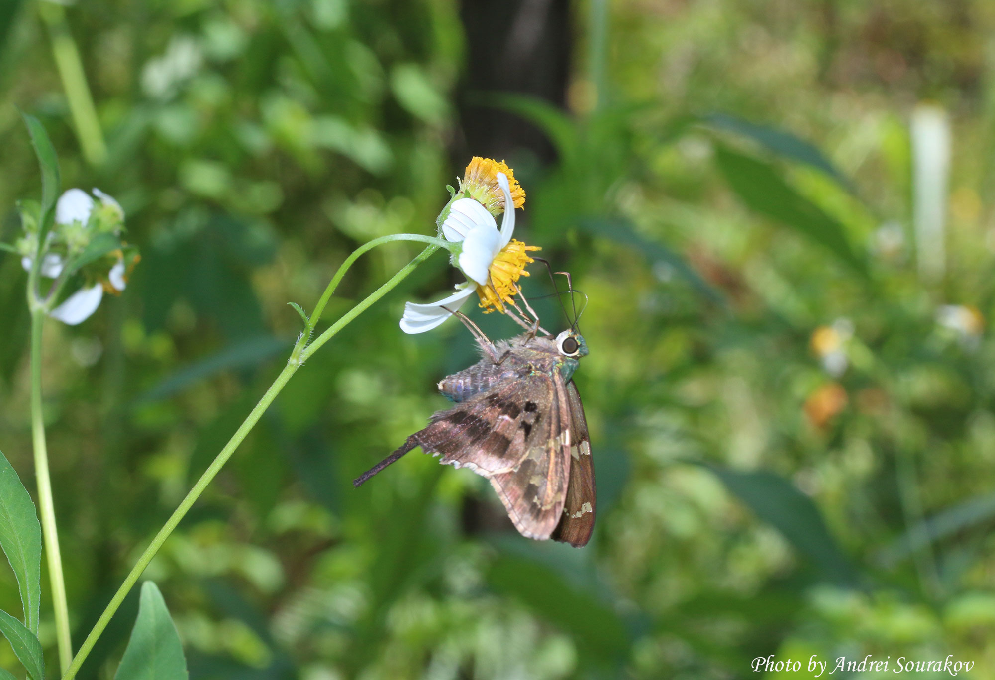 The Wikipedia page on bidens calls them a “weed.” To me, the services it provides to insects and insect lovers are worth the slight inconvenience of its needle-like sticky seeds. I propose a simple solution: mow it after it goes to seed. Here are some photos of bees, flies, and Lepidoptera feasting on bidens taken around the Florida Museum of Natural History.