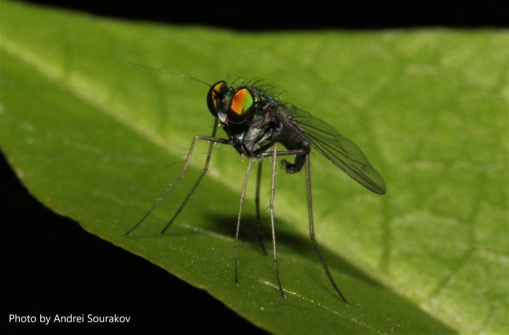 The quick startle reflexes of long-legged flies make them jump when photos are taken, so it is very hard to take a picture of a fly just sitting on a leaf surface.