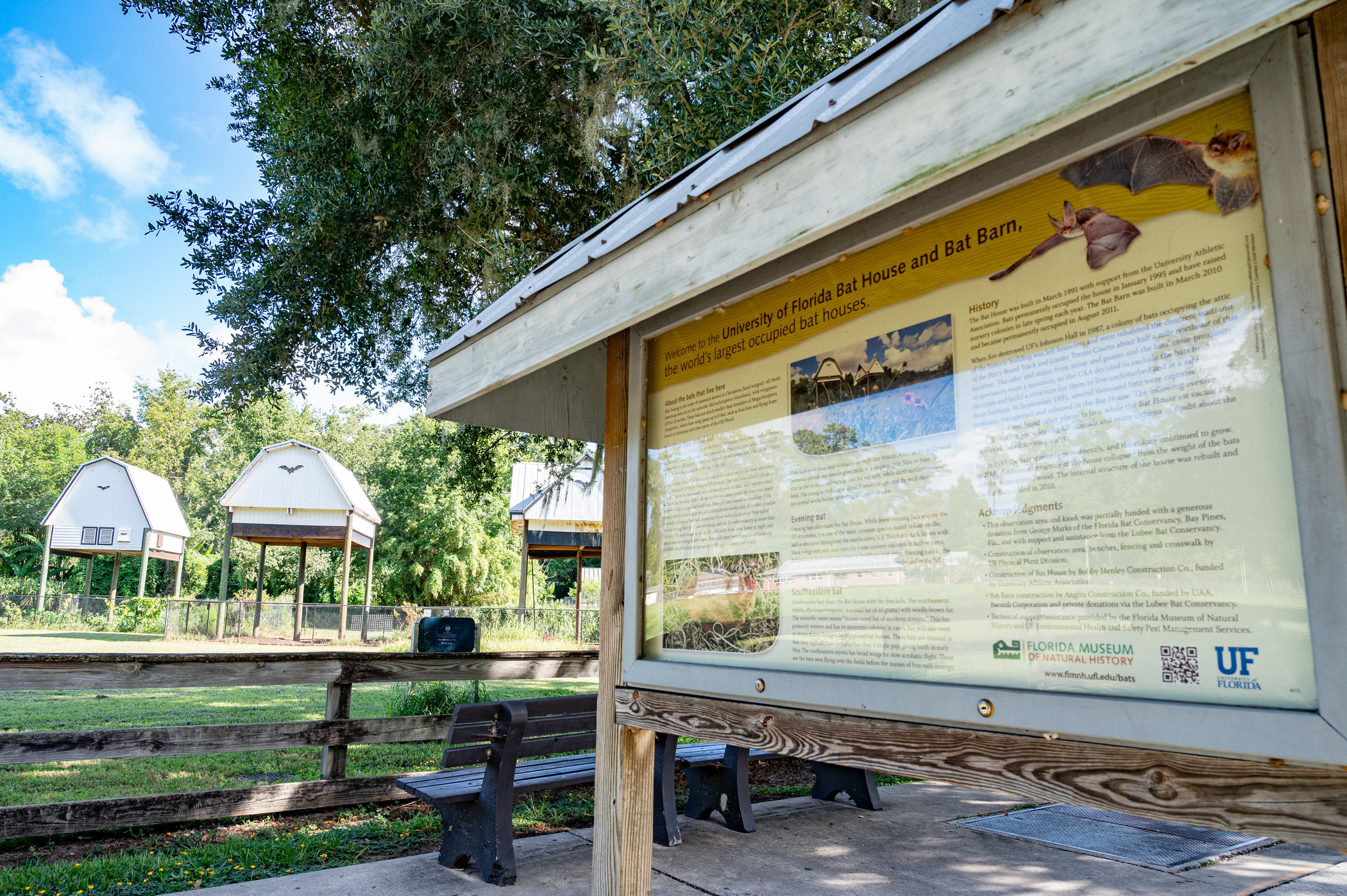The two bat houses and informational signage are located on the University of Florida campus in an open field on the north side of Museum Road across from Lake Alice.