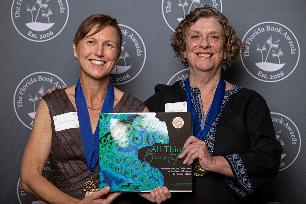 Coordinated by the Florida State University Libraries, the Florida Book Awards began in 2006 to celebrate the best of Florida literature. Now in its seventeenth year, the annual competition featured 150 eligible publications across 11 categories for books published in 2022. Heather Dewar, Kristen Grace, Beverly Sensbach and Florida Museum senior graphic designer Hollis Wooley (not in attendance) were honored with the 2022 Gold Medal for Visual Arts award on Thursday, April 20, 2023, at the annual awards banquet in Tallahassee.