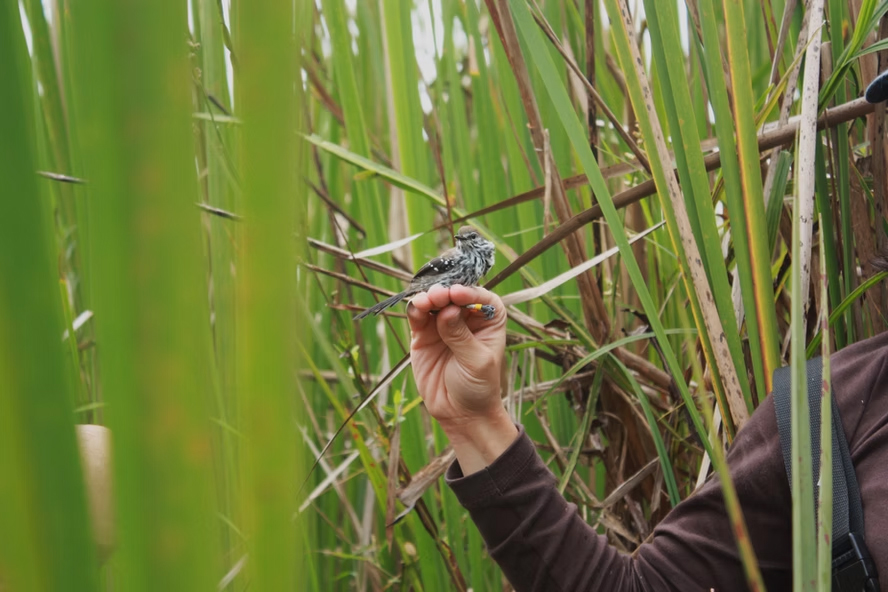 I banded and followed dozens of São Paulo Marsh Antwren individuals. Here a female that had just been banded. Photo courtesy of Glaucia Del-Rio