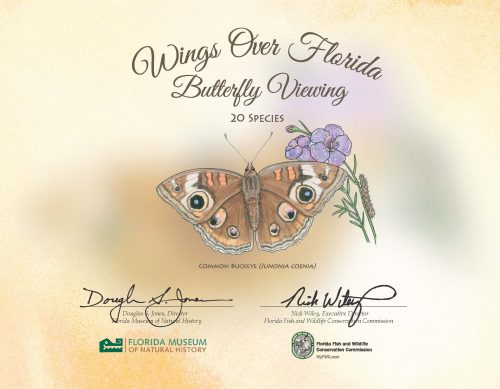 The Florida Museum has partnered with the Florida Wildlife Commission to develop Wings Over Florida, a free bird and butterfly listing recognition program that rewards people for their Florida life list and big year list achievements. Certificates are awarded to participants when they reach one or multiple listing milestones. You can apply for your certificates online or by mail. Visit the Wings Over Florida website to apply or for more information.