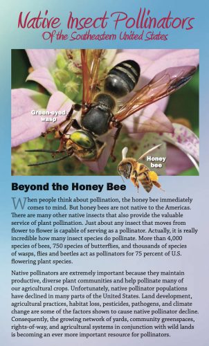 Did you know that thousands of species of bees, butterflies, wasps, flies and beetles act as pollinators for 75% of U.S. flowering plant species? Find out more about some of the most common native insect pollinators, butterflies and flowers of the Southeastern U.S. (AL, FL, GA, LA, MS, NC, SC, TN)
