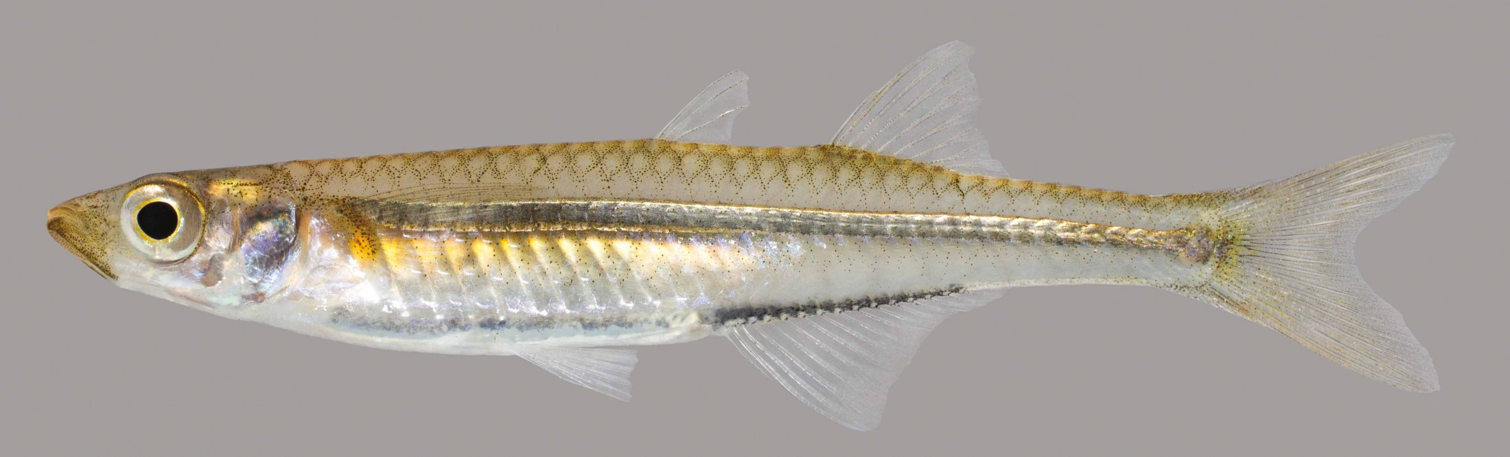 The inland silverside is a member of the New World silverside family. Its first dorsal fin originates far in front of the anal fin’s origin, and this species lacks a lateral line. It has a sickle-shaped anal fin. Inland silversides can be found in lakes and quiet areas of streams, usually swimming in schools at the surface.