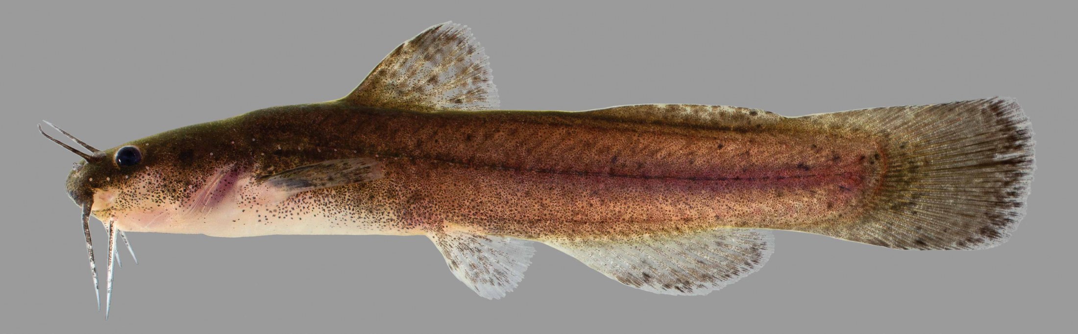 The speckled madtom is a member of the North American catfish family. This species is slender, light brown and covered with conspicuous black specks. It has a straight-edged or slightly rounded caudal fin. Speckled madtoms can be found in gravelly and sandy runs and riffles of creeks, and in small to medium rivers. They’re often found near vegetation or woody debris