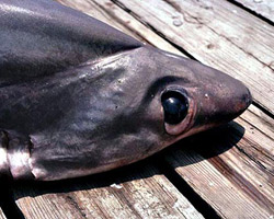 The bigeye thresher has the long tail of most thresher sharks (nearly half its body length is the upper caudal lobe or top half of the tail), but this one gets its name from its large eyes, adapted for seeing in low light. It practices diel vertical migration, meaning it spends the day in deep water, and comes to the surface at night to eat small fish and squid, which it stuns with its long tail. There are no reported unprovoked attacks by this shark so it is considered no harm to humans.