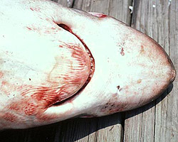 The upper jaw of the bigeye thresher consists of between 19-24 teeth while the lower jaw usually has between 20-24 teeth. The teeth, which are similar in the upper jaw and lower jaws, have slender, slightly curved cusps with smooth edges.