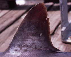 Named for an enormous upward looking eye set high in its head, the bigeye thresher is also characterized by an enormous long upper caudal lobe. The upper lobe of the caudal fin can reach lengths of 50% of the total length. This shark also has an indented forehead, a curved broad-tipped pectoral fin, and the free-rear tip of the first dorsal fin is located over or just ahead of the origin of the pelvic fins.