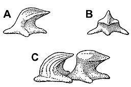 Bigeye thresher denticles: A. Lateral view of small dermal denticle, B. Apical view of same, C. Lateral view of a pair of large dermal denticles. Image courtesy Fishes of the Western North Atlantic