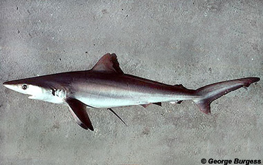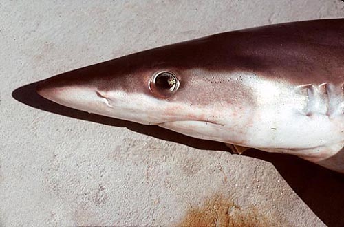 This slender, medium sized, gray-blue shark is often mistaken for similar species. It has a long, pointed nose, and a somewhat small dorsal fin, but has a typical requiem shark body and coloring. Because of its diel vertical migration, it has the large eyes suited to live at depths during the day and come up closer to the surface at night to feed.