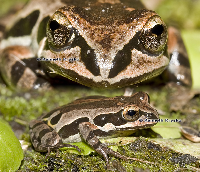 These stout frogs have very strong markings, and coloring that varies based on their habitat—from tans and red-browns, to strong greens. They are more commonly seen and heard during winter and spring months, and then they burrow into sand and leaves to wait out the warm seasons.