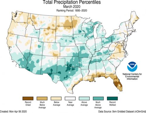 In terms of precipitation, the springtime period of February-April 2020 was only slightly drier than the 20th-century average, with total precipitation being only 1.71″ under the mean.