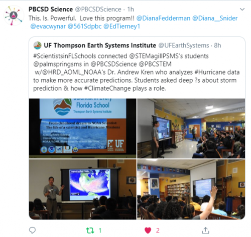 Palm Springs Middle School teacher, Heather Magill shared stories with her students about growing up in Miami during Hurricane Andrew. After the recent Palm Beach County scare and devastating aftermath in the Bahamas from Hurricane Dorian, her students had lots of questions. That’s when Magill reached out to Scientist in Every Florida School.