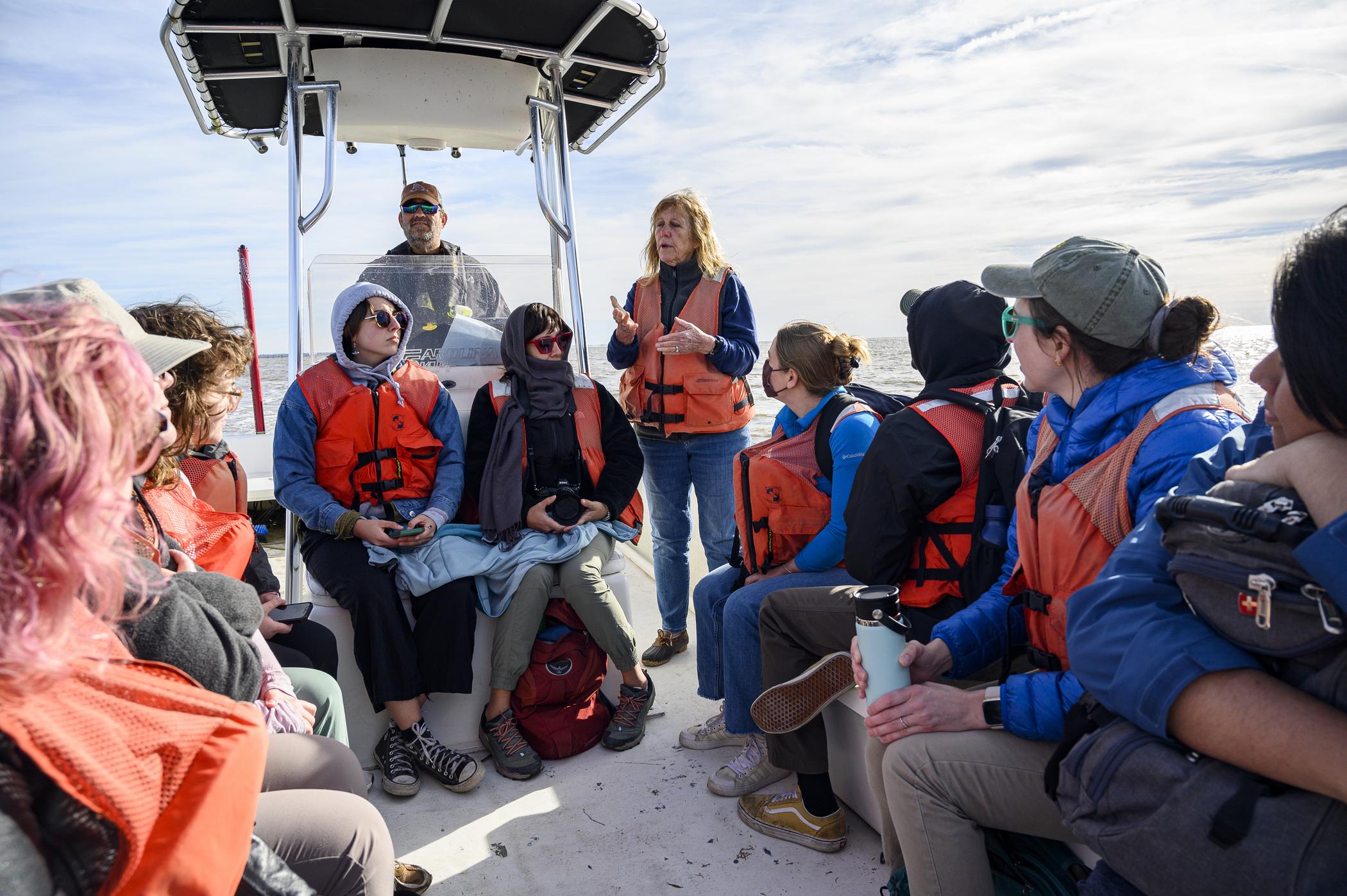 Leslie Sturmer, a Statewide Shellfish Extension Agent with UF/IFAS, led students on a boat tour of the clam aquaculture farms located just offshore of Cedar Key. Sturmer pointed out fishermen harvesting the hard clam, Mercenaria mercenaria, from their leased plots and touched on environmental stressors and predation that can lessen yields.