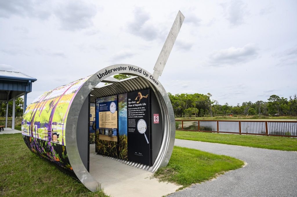 After walking through the “Underwater World Up Close” giant tunnel that shows the many macroinvertebrates that inhabit the park’s wetland cells, Sullivan drew attention to the informational exhibits and kiosks scattered throughout the park which showcase the importance of water conservation and limiting nonpoint source pollution in Ocala and Florida’s watersheds at large.