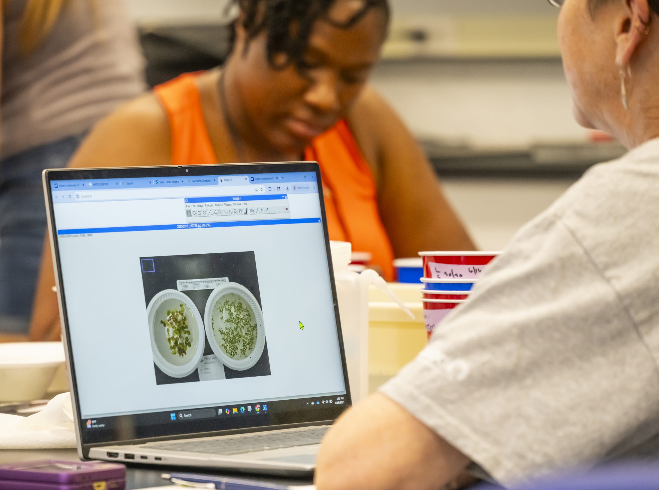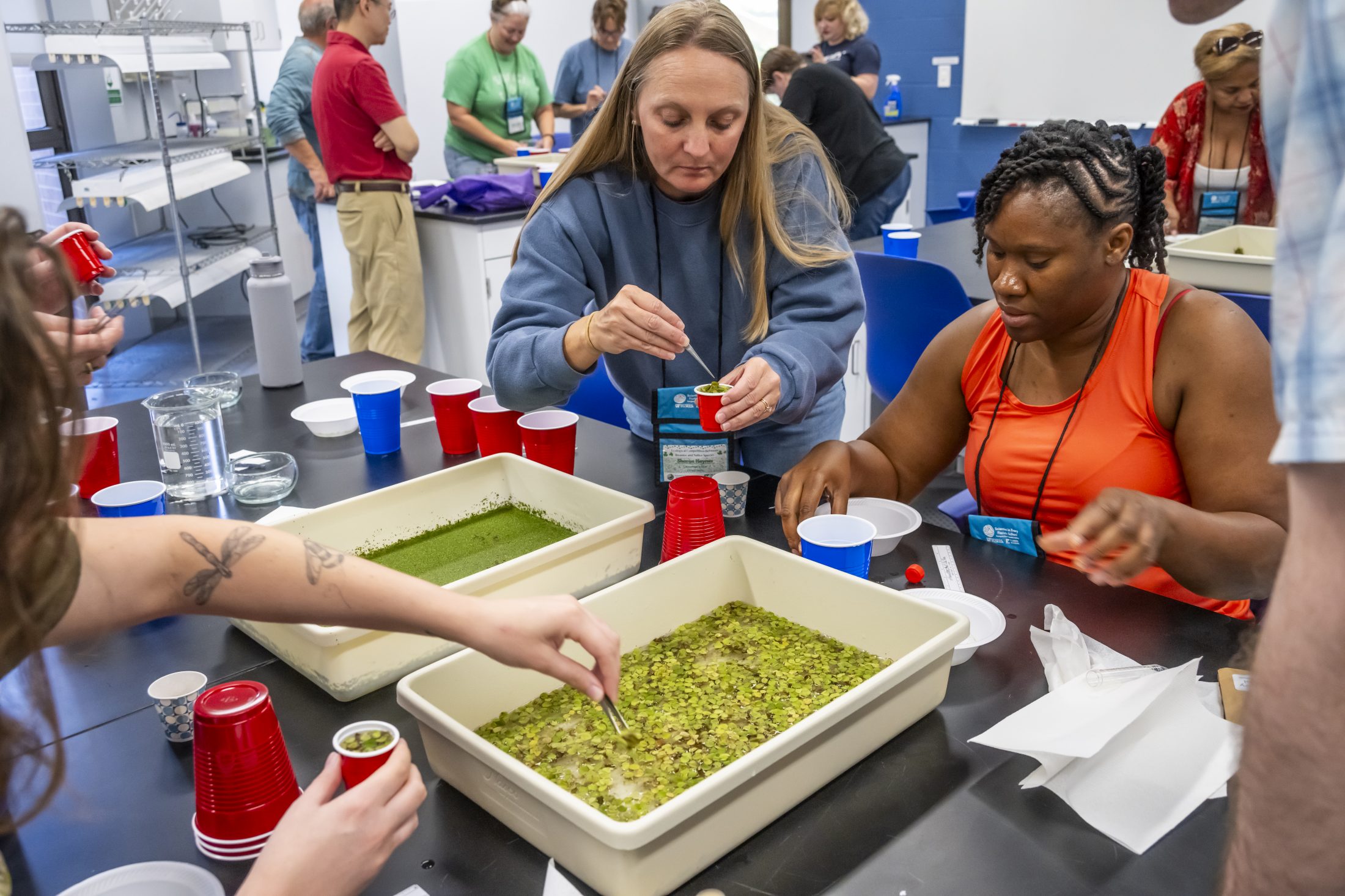 During the workshop, teachers used an experimental kit to examine ecological competition between a native and invasive species of duckweed, a fast-growing aquatic plant. To do this, teachers worked with scientists to test different scenarios of how the ratio of the native to invasive species (more native, less invasive; more invasive, less native; and equal amounts of each) impacts the growth rate of each. After they were guided through the experiment, UF researchers showed the teachers how to analyze the results.