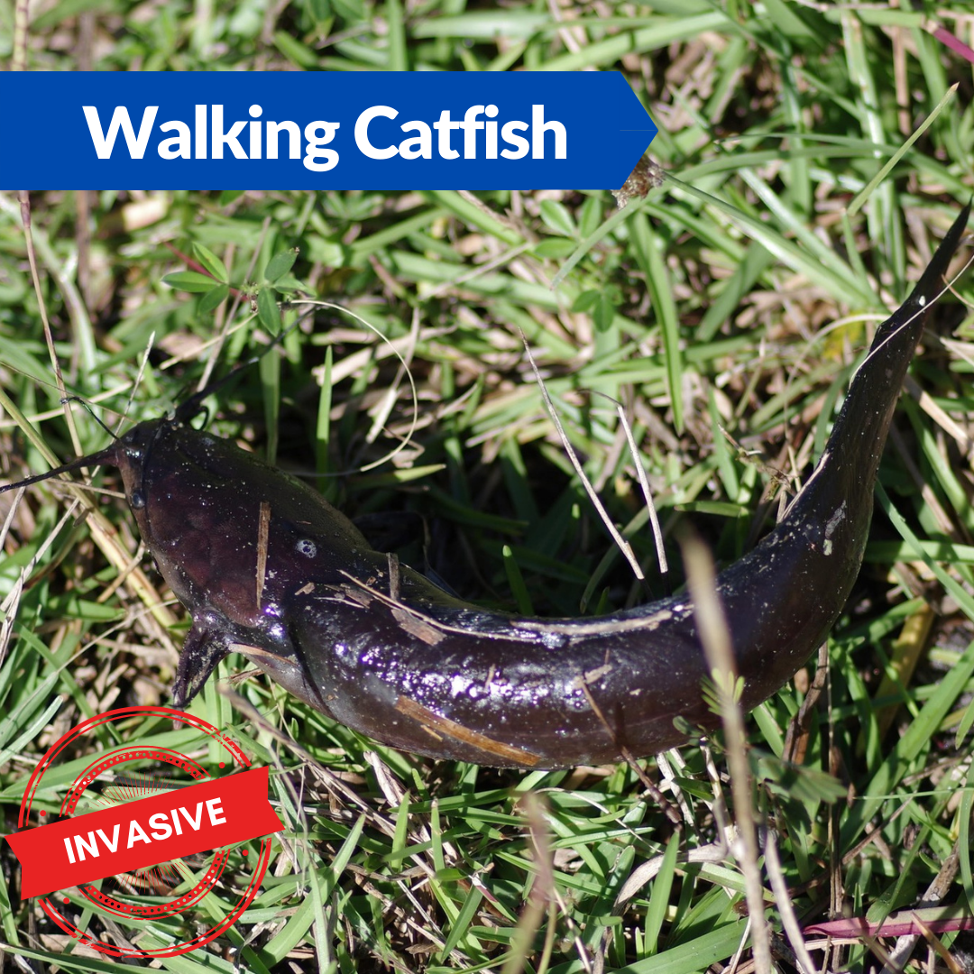 Walking catfish are an invasive species in south and central Florida regions typically found in slow-moving waters, such as ponds and canals. This freshwater fish is native to southeast Asia and was introduced to Florida in the 1960s as part of the aquaculture farming industry. Most of the damage this species has caused in Florida has been in the same aquaculture industry, invading the facilities and preying on the fish there. Like many other invasives, this fish has specific characteristics that make them more likely to be successful. 1) It can breathe air! Because of its specialized gill structure, this fish can survive out of water for a significant amount of time. 2) It can travel on land from habitat to habitat using its pectoral fins. Despite being invasive, walking catfish have several natural predators in Florida, including herons and egrets, reptiles, and mammals. As omnivores, their diet primarily consists of insects, crustaceans, fish larvae, smaller fish, and plant matter. Info from Florida Museum and National Geographic Society. Image from iNaturalist user Peter and Kim Connolly (CC BY-NC 4.0) and iNaturalist user gotcritters (CC BY-NC 4.0).