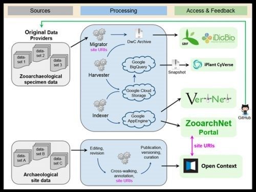 ZooArchNet, in collaboration with VertNet, is an interdisciplinary effort to provide animal-related biodiversity data to all researchers and thus to bridge the gaps that exist between paleontological and neontological biodiversity research, and between the biological and anthropological disciplines. We publish openly accessible digital data from, and available to, any researcher anywhere in the world. ZooArchNet aims to mobilize data about archaeological animal remains in a way that best supports open data/open science approaches for both biological and anthropological research. The ZooArchNet/VertNet team publishes zooarchaeological specimen data records in formats that allow these records to be shared as Darwin Core enabled datasets in open biodiversity networks (such as iDigBio and GBIF). The data records are also formatted using linked open data protocols and shared site and specimen identifiers, to allow sharing with archaeological publishers of open access data such as Open Context. The end result is maximally usable data adhering to archaeological and biological community standards, and with biodiversity and culture heritage information intact.