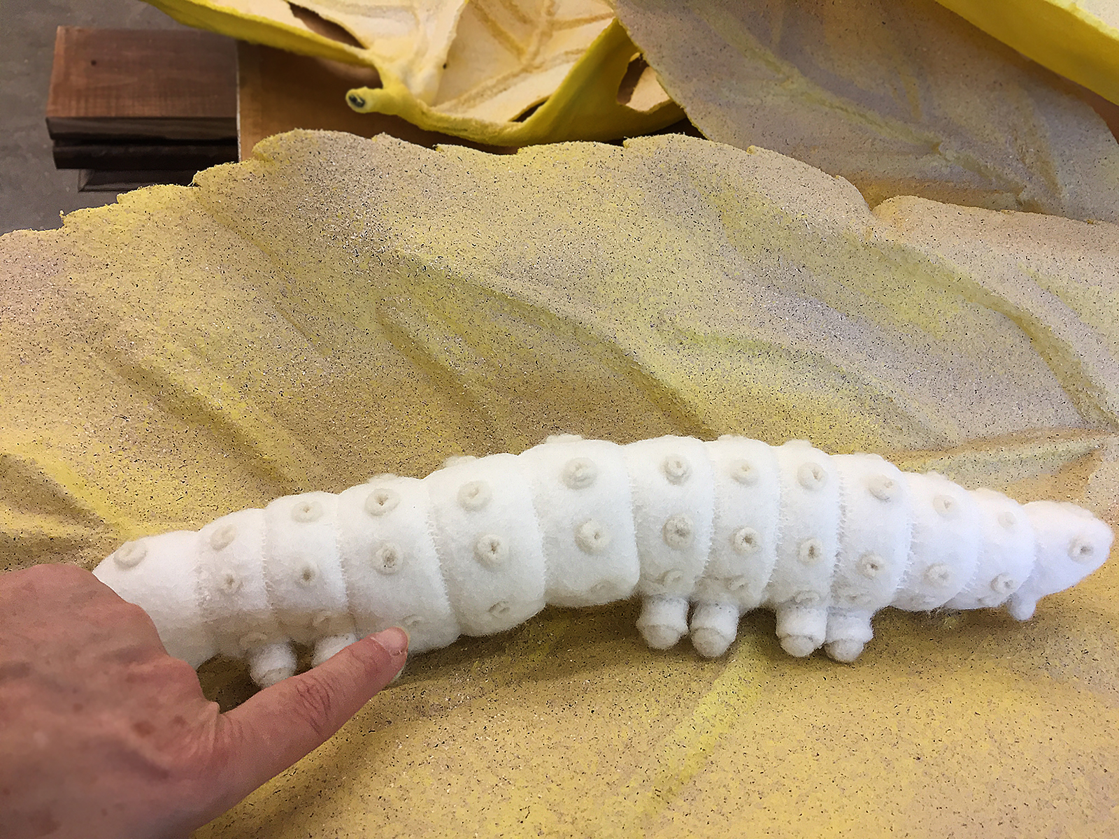 It will be assembled just prior to installation in May/June. We have completed two giant flower buds and are now working on the Zebra Longwing caterpillars. The caterpillars are taking shape! Exhibit fabricator Barb Ornstein is needle-felting each caterpillar by hand.