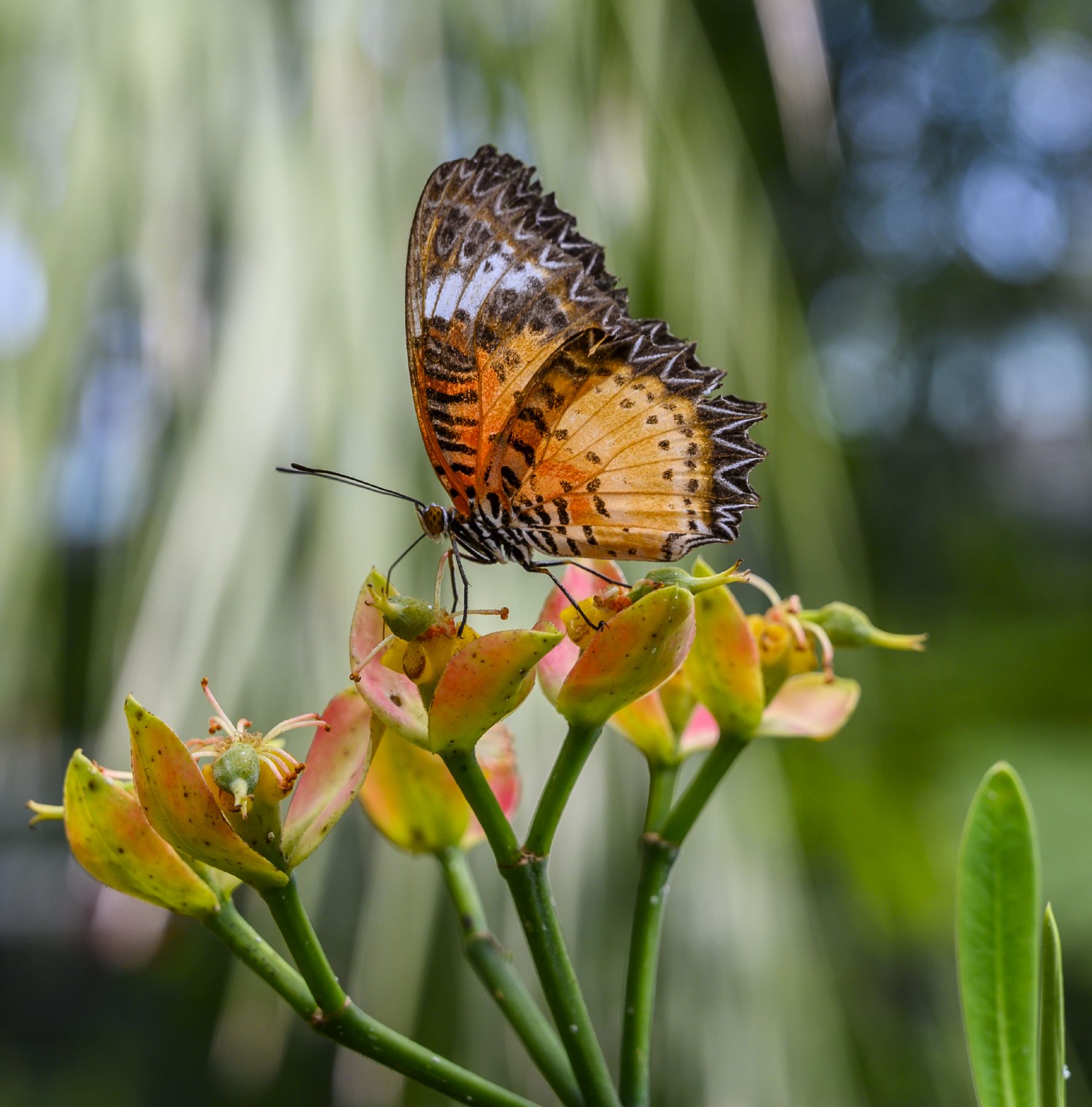 Leopard lacewing butterflies, Cethosia cyane, native to India through to southeastern China, are one of dozens of exotic species that have been displayed in the exhibit. Florida Museum photo by Jeff Gage