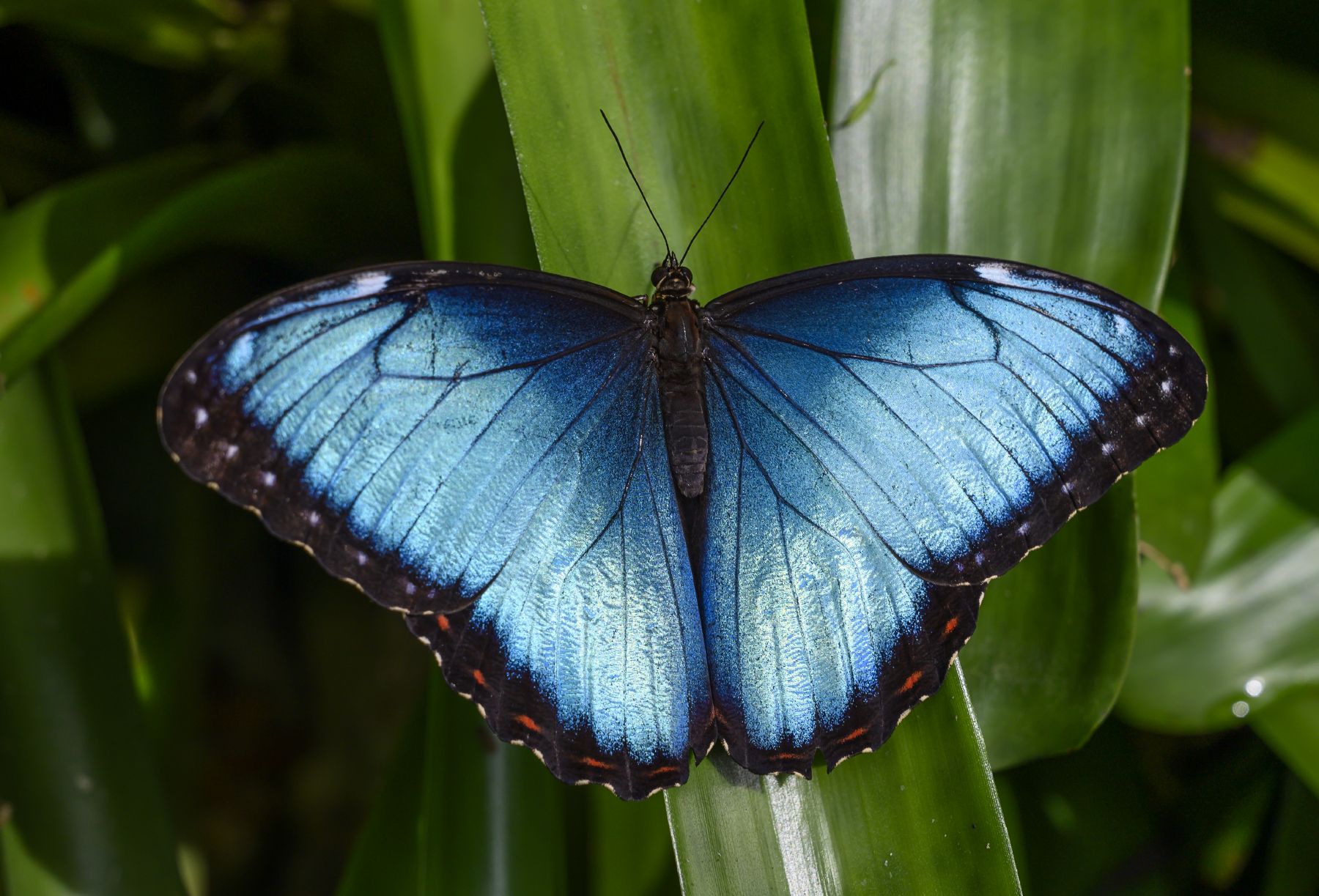 Blue morpho butterflies, Morpho helenor peleides, are famous for their shimmery blue wings, a result of microstructures on their wing scales rather than pigment. Florida Museum photo by Jeff Gage