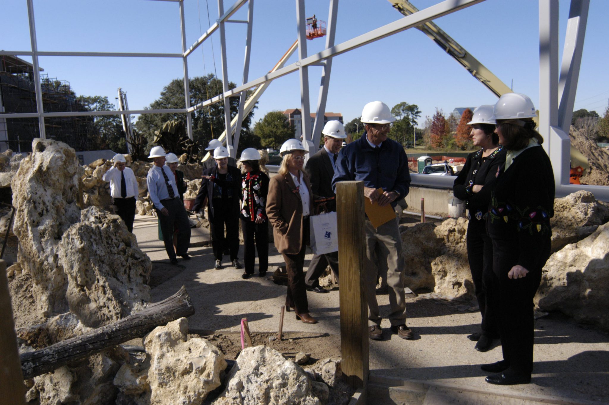 Florida Museum Associates Board members, led by Tom Emmel, tour the construction site of what was quickly becoming the Butterfly Rainforest exhibit. Florida Museum archive photo