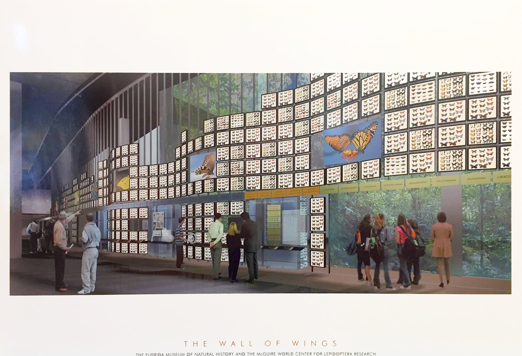 The artist’s rendering of the proposed ‘Wall of Wings’ was expanded slightly but remains true to the intention to feature hundreds of species of butterflies for visitors to explore. Florida Museum archive photo